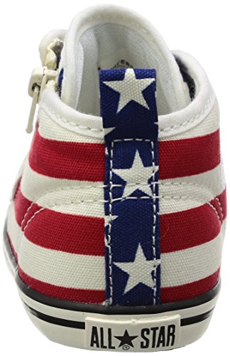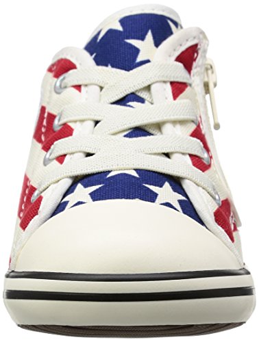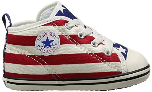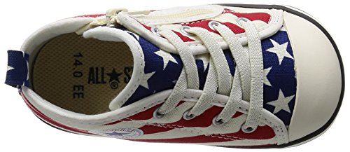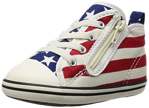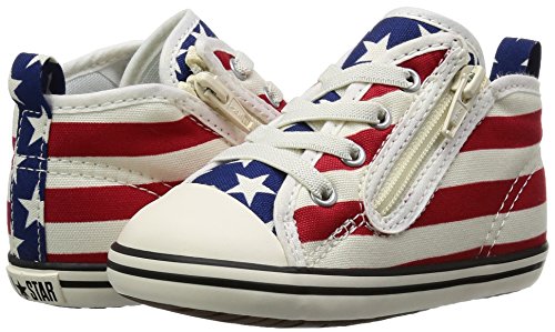 ベビー オールスター Nのプリントアレンジモデル。アメリカ国旗柄であり、コンバースを代表する柄の一つである「スターズ&バーズ」をアッパーにプリント。ゴアシューレースが縫付の仕様で解ける心配がなく、つまみやすい広めの踵テープで 脱ぎ履きしやすいデザイン。しなやかなラバーに、踵部分にはボードを内蔵し、足の曲がる位置でしっかり屈曲するソール設計。ファミリーペア(アダルト、キッズ、ベビー)モデル