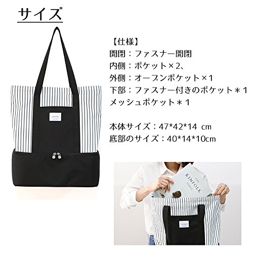 <本体サイズ>47*42*14 cm <底部のサイズ>40*14*10cm <仕様>開閉:ファスナー開閉 内側:ポケット×2、 外側:オープンポケット×1 下部:ファスナー付きのポケット*1、メッシュポケット*1 <保温・保冷>二層式の下部は保冷・保温性能付きで、飲み物やお弁当などを入れて持ち歩けます。保冷剤を入れるポケット付き、内側は防水加工で安心設計です。 <二層式デザイン>上段と下段に仕切りがあるので、上段には着替え・下段にはシューズなど分けて収納することができます。 <大容量>A4サイズ収納可能な大サイズで、マザーズバッグとしてはもちろん旅行や通学通勤、ジムやピクニックなど幅広くお使いいただけます。