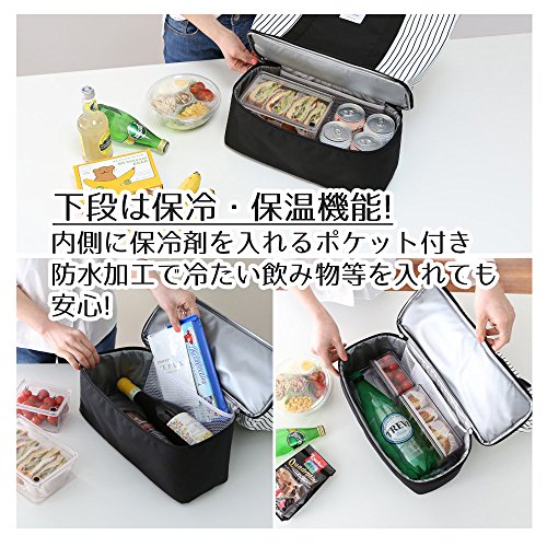 - <保温・保冷>二層式の下部は保冷・保温性能付きで、飲み物やお弁当などを入れて持ち歩けます。保冷剤を入れるポケット付き、内側は防水加工で安心設計です。