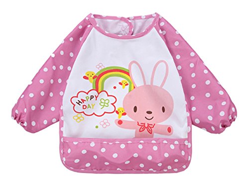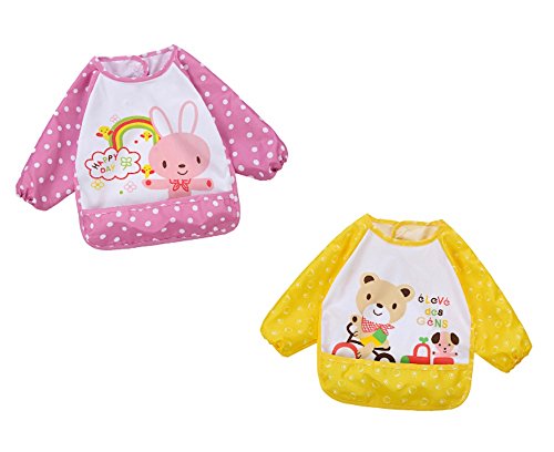COTARON ベビーエプロン 長袖 ポケットつき 防水 動物柄 1歳〜3歳 2色セット (2色タイプA(ヒモ))