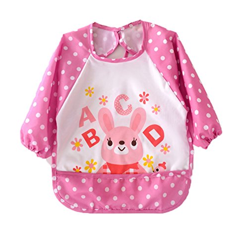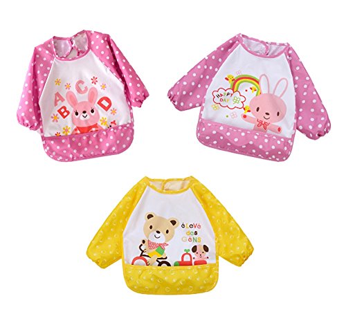 COTARON ベビーエプロン 長袖 ポケットつき 防水 動物柄 1歳〜3歳 3色セット (3枚セット女の子(ヒモ))