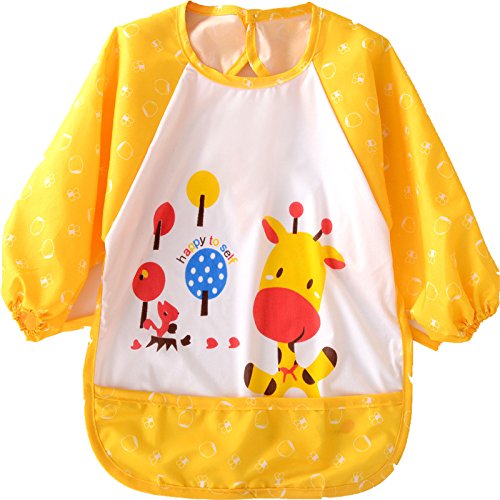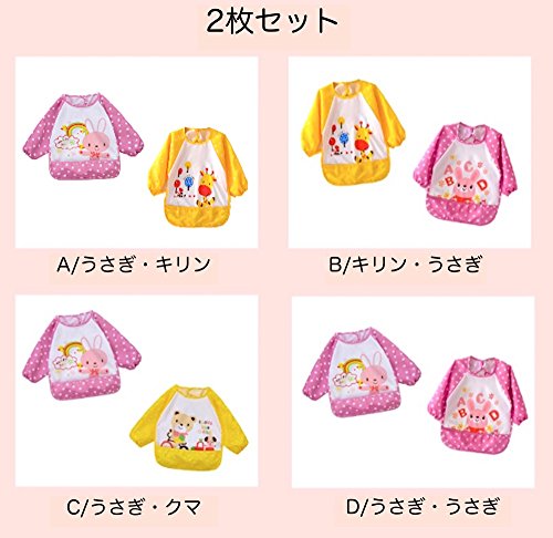 COTARON (コタロン) ベビーエプロン 長袖 ポケットつき 防水 動物柄 1歳~3歳 2枚セット (B/キリン・うさぎ)