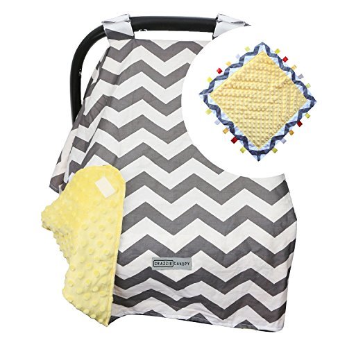 5 Colors **Summer Sale!** Car Seat Canopy by CRAZZIE with Matching Soft TAGZ Blanket (Grey Zigzag Yellow Minky with TAGZ blanket) by CRAZZIE