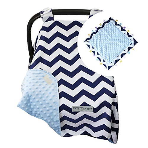 5 Colors **Free Blanket** Car Seat Canopy by CRAZZIE with Matching Soft TAGZ Blanket (Navy Zigzag Blue Minky with TAGZ Blanket) by CRAZZIE