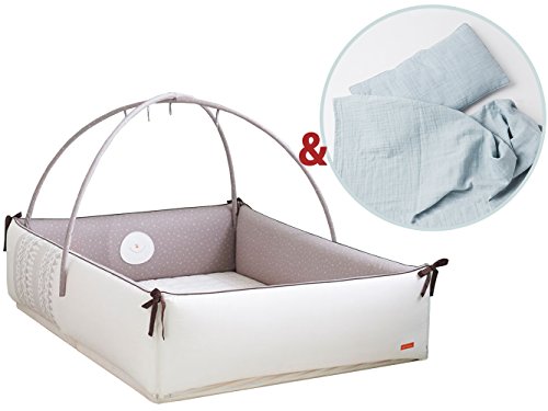 子ども用品には、原色を使ったものが多く、リビングなどに置くと、すっかり子ども部屋になってしまいませんか? クリームハウスのバンパーベッドは、北欧スタイルのシンプルなデザインで、インテリアを損なうことがなく、クリームカラーによりお部屋を広く感じさせることができます。広げてプレイマットとしてもお使いただけます。バンパー部は取り外しができるので、シートクッションとして使用したりも可能です。 10層構造で厚さが4cmのマットは、防音・衝撃分散に優れています。お子様が毎日触れるものなので、LOHAS認証素材を使用し、安心、安全を追求しました(HB,LOHAS,KC,ASTM認証/CE取得/KCL合格/Fiti,SGS試験済)。 汚れに強く、お手入れも簡単。ハンドメイドで質感が良く、細部まで気を配り製造しています。モビールを取り付けるバーが付属しています。マットはキルティング、撥水処理加工を施したコットン100%のカバーが。さらに、キトサン抗菌加工処理で赤ちゃんも安心。※「イヌア ソフトガーゼ寝具」の枕に使われる中綿は、お客様から中綿増量のご要望を多く頂きましたことと、枕の高さ調整がご家庭でも簡単にできるよう、多めに充填しています。お手数ではございますが、中綿の量を調整してから、カバーを取り付けてご使用下さい。調整をしていただきませんと、カバーの取り付けが困難な場合がございますが、これにつきましては不良品ではございませんので、あらかじめご了承下さい。取り出した中綿は枕にヘタリが生じた際の補充や、高さ調整用に保管をお願いいたします。