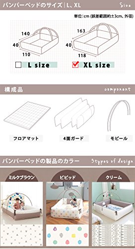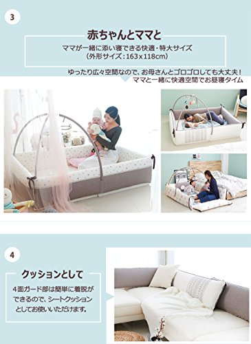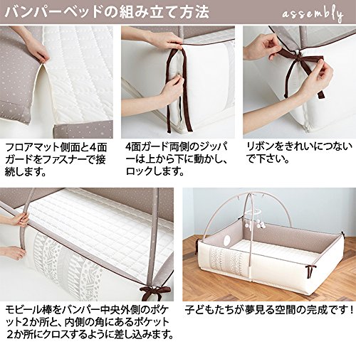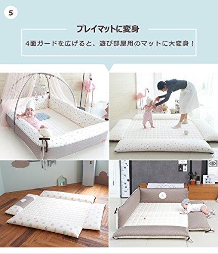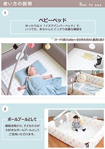 子ども用品には、原色を使ったものが多く、リビングなどに置くと、すっかり子ども部屋になってしまいませんか? クリームハウスのバンパーベッドは、北欧スタイルのシンプルなデザインで、インテリアを損なうことがなく、クリームカラーによりお部屋を広く感じさせることができます。広げてプレイマットとしてもお使いただけます。バンパー部は取り外しができるので、シートクッションとして使用したりも可能です。 10層構造で厚さが4cmのマットは、防音・衝撃分散に優れています。お子様が毎日触れるものなので、LOHAS認証素材を使用し、安心、安全を追求しました(HB,LOHAS,KC,ASTM認証/CE取得/KCL合格/Fiti,SGS試験済)。 汚れに強く、お手入れも簡単。ハンドメイドで質感が良く、細部まで気を配り製造しています。モビールを取り付けるバーが付属しています。マットはキルティング、撥水処理加工を施したコットン100%のカバーが。さらに、キトサン抗菌加工処理で赤ちゃんも安心。