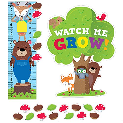 This whimsical Woodland Friends growth chart features an owl, squirrel, rabbit, skunk, hedgehog, fox, raccoon, deer, and bear stacked up tall on a tree stump. Student pieces are acorns, leaves and toadstools. Chart includes inch and centimeter measurements. Set includes 40 pieces:"Watch Me Grow!" title piece, 3 growth chart sections, and 36 student pieces to record measurementsFully assembled display measures over 6.5 feet tall!
