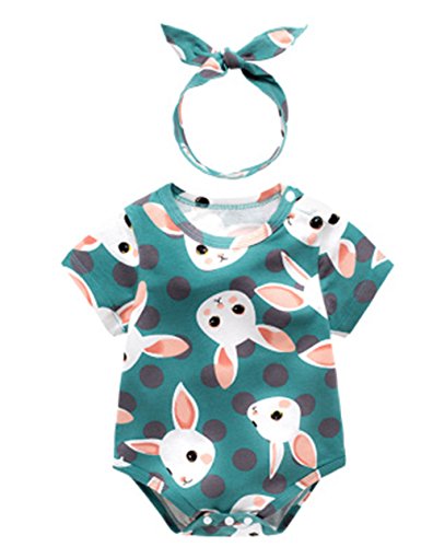 CXYP ベビー服 カワイイ ロンパース  ウサギ 赤ちゃん 綿100 半袖 Baby ボディースーツ 肌着 さらさら肌触り 新生児から  50~90  ヘアバンド付き  (73cm, ビリジャン )