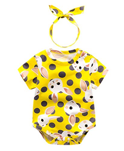 CXYP ベビー服 カワイイ ロンパース  ウサギ 赤ちゃん 綿100 半袖 Baby ボディースーツ 肌着 さらさら肌触り 新生児から  50~90  ヘアバンド付き  (66cm, イエロー)