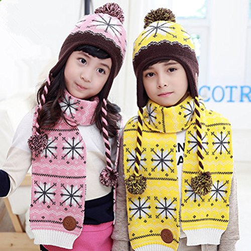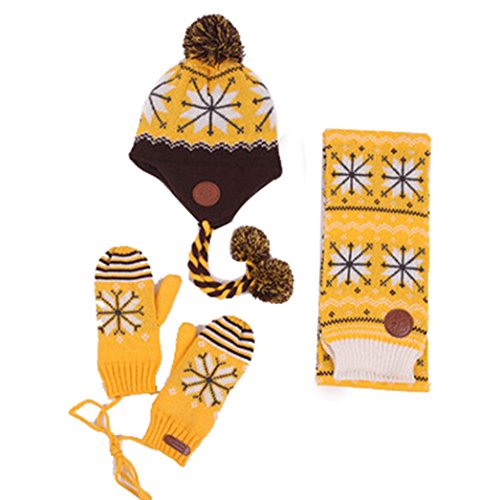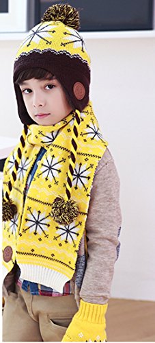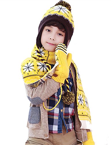CXYP ボーイズ ガールズ 秋冬 帽子&手袋&マフラー 3点セット ニット帽 カワイイ 雪柄 防風 防寒 毛糸 子供 あったか 男女兼用 (48~52cm, イエロー)