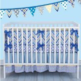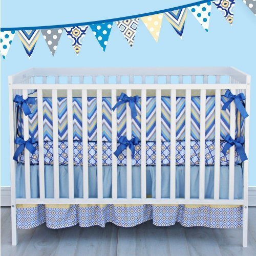 Crib set includes; 4 separate slip covered bumpers, 1 fitted sheet, 1 skirt;100% cotton fabric;Machine wash and tumble dry