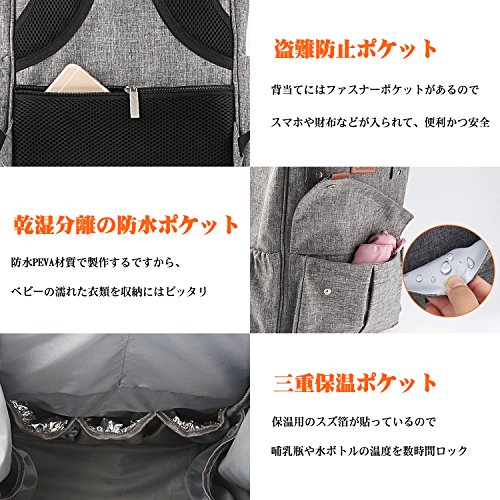 - 保温・乾湿分離・盗難防止:哺乳瓶専用ポケットは、スズ箔で暖かく保ちます。防水PEVA材質で製作するポケットだから、ベビーの濡れた服は入れても大丈夫。背当てにあるファスナーポケットは防犯性を高める設計、スマホ、財布などの小物が入られて、便利かつ安全。