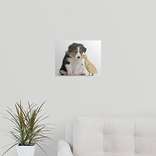キャンバス上需要壁Peel「ボーダーコリー子犬壁アートプリント( 6週間古い) Playing With Domestic Duckling ( 1 Week古い) 14" x 11" 1103251_14_14x11_none