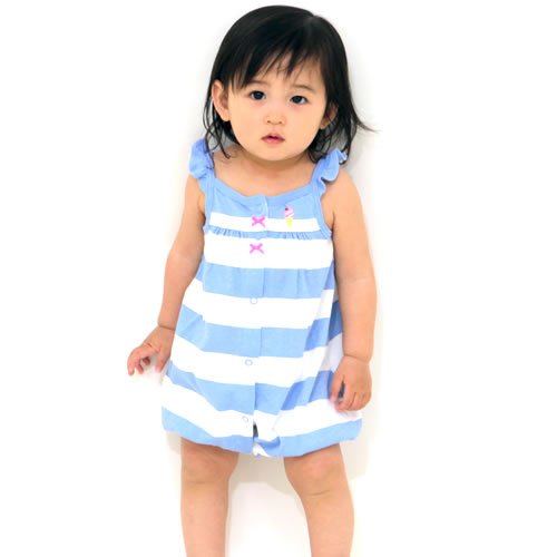 - 紫がかったブルーと白のボーダー柄のロンパースです。