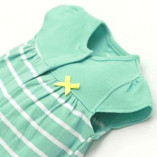 - エメラルドグリーンと白のストライプ柄のロンパースです。
