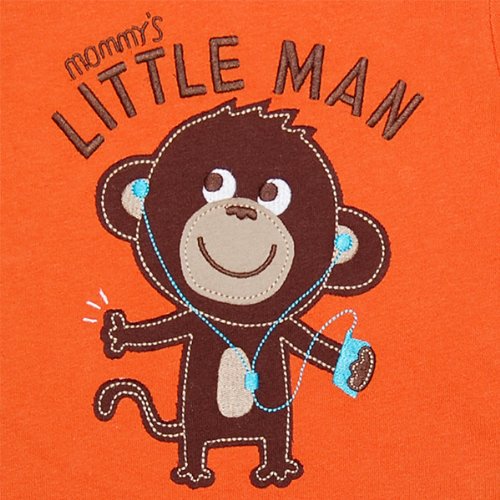 - オレンジベースに音楽を聴いてノリにノッているモンキーアップリケとmommy's LITTLE MANの刺繍が入ったキュートな重ね着風シャツ