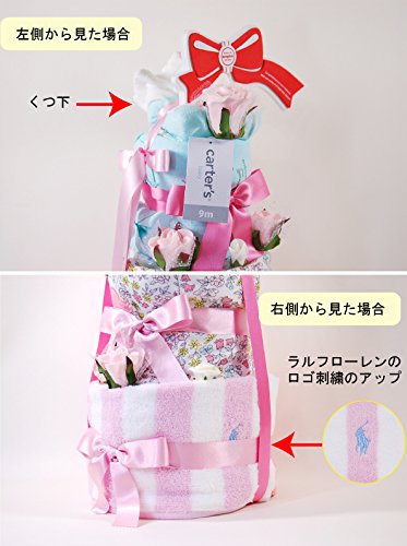 《オムツケーキの詳細》 コットン100% 【セット内容】ラルフローレンからタオル、カーターズよりボディスーツ+パンツ+靴下の豪華5点 ・オムツ:パンパース ・Sサイズ (4~8kg) 28枚 ・Mサイズ(6~11kg):25枚 ・オムツケーキの寸法 : 高さ46cm ★カーターズとラルフローレンのタオル・パンパースで作った豪華3段オムツケーキの登場です!長袖+半袖ボディスーツはアンダーとしても1枚でもとっても可愛いくて重宝です!くつ下・タオルの柄はお任せになります。ラルフローレンのフェイスタオルは33cm×33cmでお出かけに最適な大きさ。すべてコットン100%でとっても肌さわりがいいです!★直径21cm、高さ46cmの大きなオムツケーキならプレゼントされた方もビックリされると思いますよ!当店のキャスキッドソンおオムツケーキと豪華さは同じです!メッセージが必要な場合はラッピングのメッセージ欄にご記入下さい。※ラッピング済商品ですので白箱に宅急便伝票を貼ります。包装紙は選べませんのでご了承ください。※タオルの柄や靴下、造花、ラッピングリボンが予告なく変更になる場合もございます。 ※ご注文頂いてから4-5日以降の発送になります