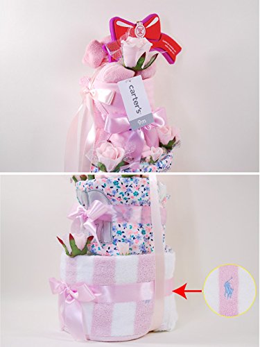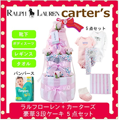 ラルフローレン,カーターズ 正規品 オムツケーキ,3段 5点セット ボディスーツ2枚+パンツ+靴下+パンパース オムツSサイズ Elephants (女の子)