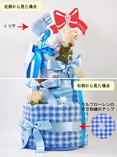 《オムツケーキの詳細》 コットン100% 【セット内容】ラルフローレンからタオル、カーターズよりボディスーツ+パンツ+靴下の豪華5点 ・オムツ:パンパース ・Sサイズ (4~8kg) 28枚 ・Mサイズ(6~11kg):25枚 ・オムツケーキの寸法 : 高さ46cm ★カーターズとラルフローレンのタオル・パンパースで作った豪華3段オムツケーキの登場です!長袖+半袖ボディスーツはアンダーとしても1枚でもとっても可愛いくて重宝です!くつ下・タオルの柄はお任せになります。ラルフローレンのフェイスタオルは33cm×33cmでお出かけに最適な大きさ。すべてコットン100%でとっても肌さわりがいいです!★直径21cm、高さ46cmの大きなオムツケーキならプレゼントされた方もビックリされると思いますよ!当店のキャスキッドソンおオムツケーキと豪華さは同じです!メッセージが必要な場合はラッピングのメッセージ欄にご記入下さい。※ラッピング済商品ですので白箱に宅急便伝票を貼ります。包装紙は選べませんのでご了承ください。※タオルの柄や靴下、造花、ラッピングリボンが予告なく変更になる場合もございます。 ※ご注文頂いてから営業日(土日祝除く)で4-5日以降の発送になります
