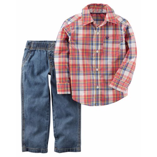 カーターズ carter's 男の子用レンガx青マドラスチェック犬刺繍入り襟付きシャツxデニムコーデパンツ上下2点セット (18months(78-83cm)) [並行輸入品]