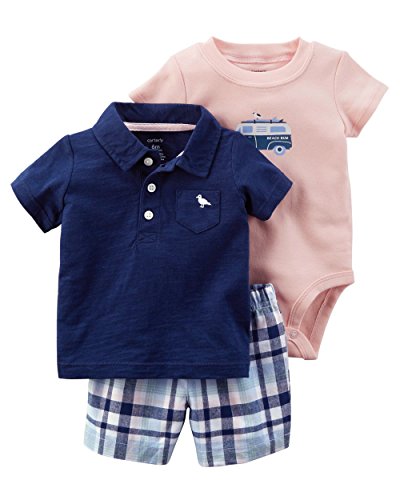 《Tシャツ3点セットの詳細》 ●素材:コットン100% ★カーターズ正規品、半袖襟付きシャツ+半ズボン・ボディースーツの便利な3点セットの登場です! 半袖シャツは紺色無地で衿付き。前ボタンが3つ付いてます。 左胸にはポケットが付いて可愛い鳥が刺繍されてアクセントになっています。 ピンクのボディスーツにはボタン等がないので赤ちゃんは気持ちよく1枚でもアンダーとしても着せられ便利です。 センターにはサーファーカーの屋根に鳥が乗っているイラストがプリントされています。お股にはスナップが3つ付いているのでオムツ替えはラクチンです。 半ズボンはブルーに薄いピンクが入ったチェック柄でシャツでもボディスーツでもどちらでもコーディネートされていますので可愛いです。ウエストはゴムで脱ぎ着がラク。