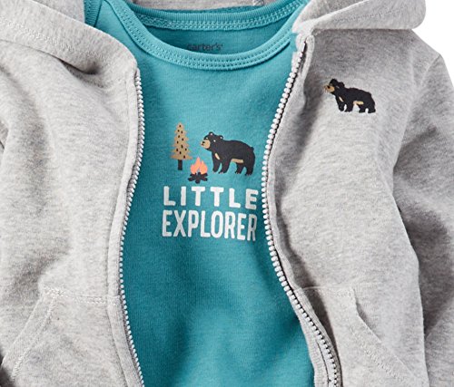 《パーカー3点セットの詳細》 コットン100% 【セット内容】長袖パーカーと半袖ボディスーツとパンツの3点セット ★出産お祝いに最適の長袖パーカー&パンツ&半袖ボディースーツの3点セットの登場です!温度差があるこの季節、こまめに着替えさせられるこのセットは大変便利です♪ ★薄手のスウェット地のパーカーはファスナーで全開するので脱ぎ着がラクチン。ベアーの刺繍のワンポイントが入っています。 ★ボディスーツは空色で胸元にはたき火をしているベアーとLittle Explorerのプリントが入っています。また小股にはスナップが付いてオムツ替えも出来るので便利! ★パンツのウエストはゴムでオムツ替えラクチン♪ このセットは出産お祝いに本当にに喜ばれますよ♪