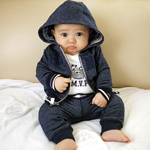《パーカー3点セットの詳細》 【素材】パーカー&パンツ:コットン60% ポリエステル40% ボディスーツ:コットン100% 【セット内容】長袖パーカーと半袖ボディスーツとパンツの3点セット ★ブルーのスウェットの長袖パーカーとパンツ、半袖ボディスーツのお買得な3点セットが登場! 軽くて暖かい裏起毛のパーカーは1枚あると重宝します。ファスナーで全開するので気温の変化にすぐに対応出来ます♪ しっかりしたファスナーを開けると身頃は裏起毛でパーカーのフードにはコットンのチェック柄の裏地が付いて可愛いです。 両脇にはポケットが付いて、胸元には“HUNK”のアップリケが付いてます。 ★半袖ボディスーツはコットンで肌さわりが良く、肩や背中にボタンがないので赤ちゃんは気持ちいい!小股にはスナップが付いているのでオムツ替えはラクチンです♪ ★パーカーと同じ生地のパンツは伸びる生地なので動きやすく、ウエストはゴムでお着替えラクチン!