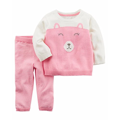 カーターズ carter's 女の子用ベビーピンクxホワイトまん丸クマさんフェイスニットセーターxボーダーコーデパンツ上下2点セット (12months(72-78cm)) [並行輸入品]