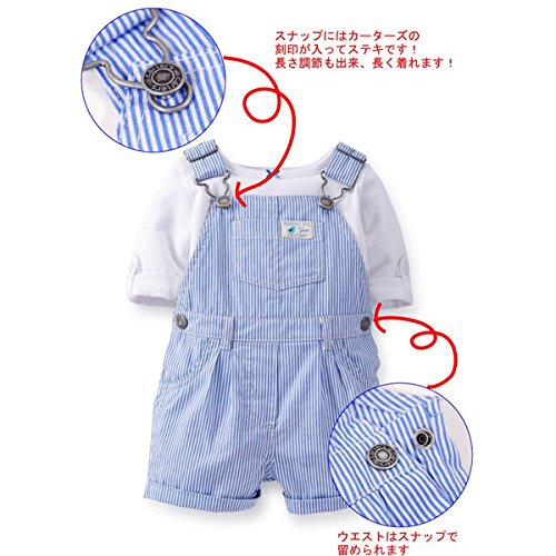 - ◎オーバーオールのショルダーは長さ調節出来、ウエストにもスナップが付いているので脱ぎ着が楽!5分丈の白のTシャツは薄手なので真夏でも大丈夫。折って着せれば長い間着せられます!また、スナップボタンはカーターズの刻印が入って豪華!すべてコットン100%なので汗を吸いとっても気持ちいいですよ!