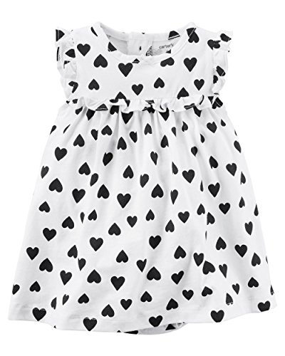 《ワンピース型ロンパースの詳細》 ●素材:コットン100% ★カーターズ正規品、ワンピース型ロンパースと長袖カーディガンのお得な2点セットの新作が登場しました!モノトーンなのでフォーマルなシーンでもOK!人気シリーズなのでご自分のお子様に、出産お祝いなら大喜びされますよ。 ★白地に黒のハートが可愛いワンピースの袖はギャザーが入ったフレンチスリーブでヨークの下もギャザーが入ってたっぷりしたデザインなので赤ちゃんは着心地がよく動きやすいワンピースです。中にTシャツを着てもいいと思います。 カーディガンは真夏でもお出掛け先、朝、晩の涼しいときに活躍しますよ。 ★ワンピースの後ろにボタンが3つ付いてお着替えラクチン! ★スカートの裏にボディースーツが付いているのでお腹も冷えない優れたデザインです。スナップでオムツ替えもラクチンです。
