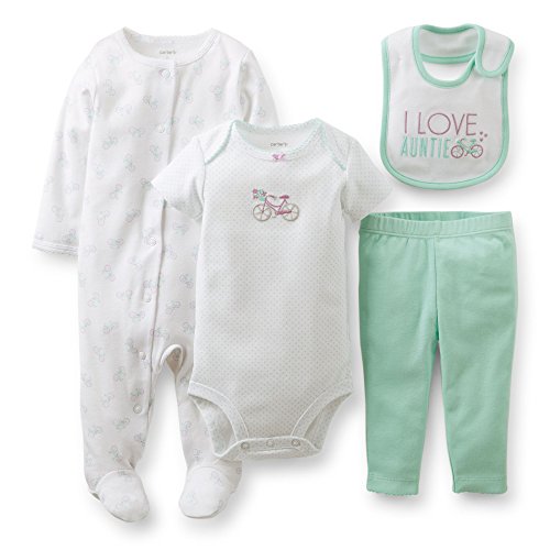 Everything you need for baby's first take me home outfit is conveniently bundled in this simple set. Sleep & Play with matching bib, footed pants and essential bodysuit will dress your new infant girl to meet the world. What a great gift for any new baby girl!