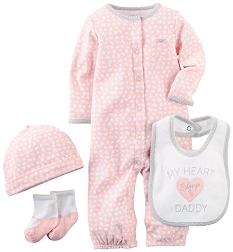 Perfect for your baby girl's first day home, this set is complete with a converter gown, bib, sweet footie socks and a cap to match so she's cute and comfy head to toe.