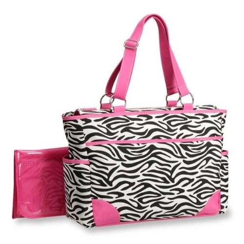 Looks like a fun zebra fashion tote, works like a well-organized diaper bag with a roomy interior and eight pockets.