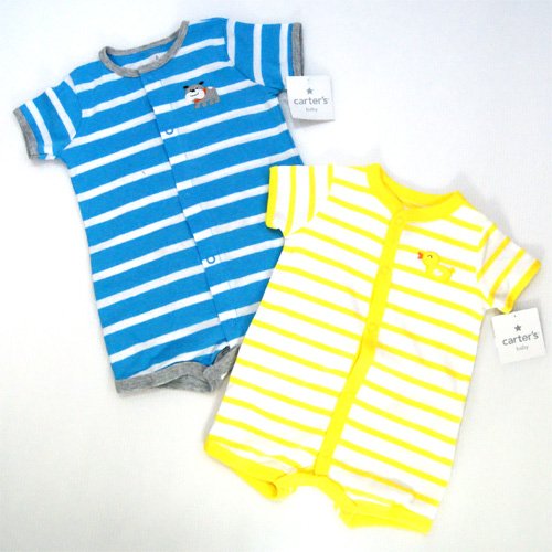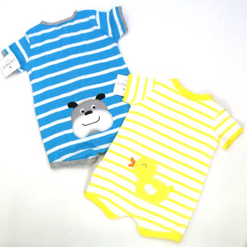【アメリカ買付商品】 Carter's カーターズ ベビー ロンパース お尻の大きなアップリケがとってもかわいいロンパース☆ 前身頃フォックで両足元まで全開するのでお着替えも楽ちん。 カラー:ブルーイエロー 素材:コットン100% サイズ:3ヶ月=55-61cm 6ヶ月=61-67cm 9ヶ月=67-72cm 洗濯表示:洗濯機可 仕入国:アメリカ 生産国:中国
