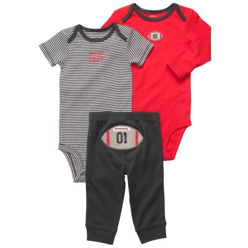 He's a good sport in this set that's two outfits for one great value. The pants have adorable turn-me-around football and looks oh-so cute.