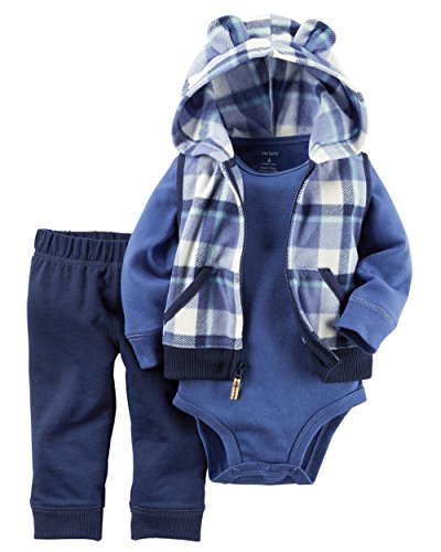 Crafted in plush fleece with a cozy animal ear hood, this plaid vest set is complete with a soft cotton bodysuit and pants.