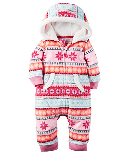 Super soft and cozy, this bright fleece jumpsuit keeps her warm from dusk to dawn in a playful winter print. Ribbed cuffs, a kanga pocket and a snow fleece lined hood complete this adorable look.