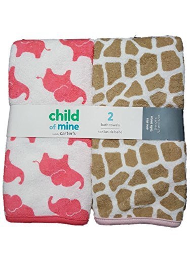 Carter's Child of Mine 2 pack baby girls bath towels;Pink elephant and giraffe prints;Measures: 29 x 29;85% Cotton, 15% polyester