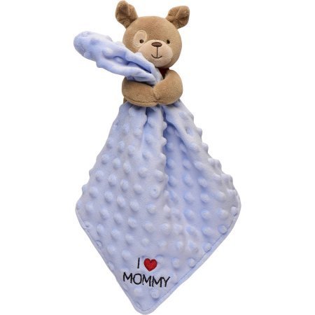 The Child of Mine plush security blanket and rattle is a cuddly companion for baby. The plush adorable puppy hugs a super-soft security blanket with I love Mommy embroidered on the front and satin on the reverse. Perfect for small hands, this friend will go anywhere baby goes.;Features puppy hugging blanket;I love Mommy embroidery;Raised dot texture on front, satin on reverse;Fabric: 100 percent polyester, Varied fabric textures soothe baby, Toy and rattle entertain baby