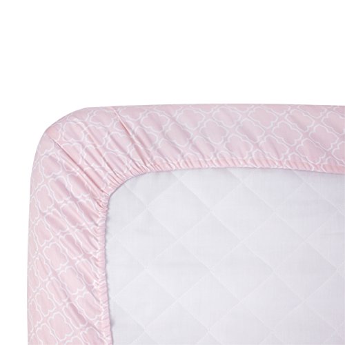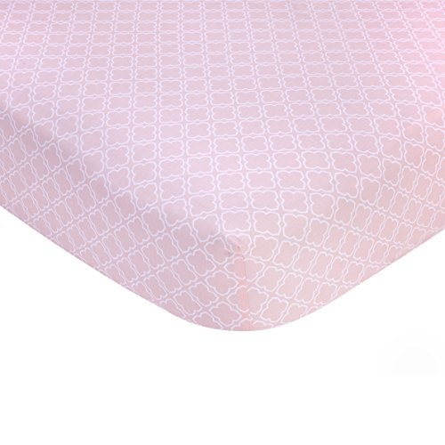 Fabrics are 100% Cotton Sateen;Print Pink Trellis - All-over print pink with white trellis.;Fits a Standard Size Crib Mattress 28 x 52;Machine wash separately in cold water, gentle cycle. Use only non-chlorine bleach when needed. Tumble dry on low heat. Iron on low heat when needed. Do not dry clean.