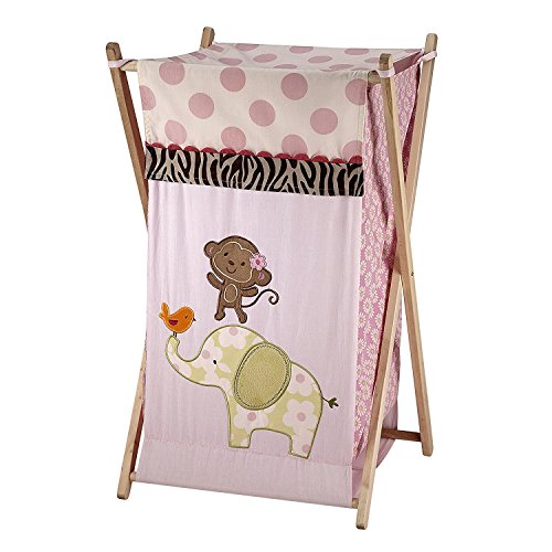 Carter's jungle collection hamper helps to keep your nursery organized. Wooden frame folds flat for easy storage and includes a removable mesh liner for easy access. The body of the hamper comes in a combination of polka dot, floral, and animal prints and features miss monkey dancing on top of her elephant friend. Coordinates with Carter's jungle collection bedding and decor.