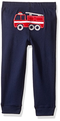 消防車のアップリケ付きの紺ボーダー柄長袖ボディスーツと、赤無地に消防ハットの発泡プリント付きの半袖ボディスーツ、お尻に大きな消防車のアップリケ付きの紺のスウエットロングパンツの3点セットでオールシーズン大活躍! ボディスーツは肩が2重になって着やすいデザインです。