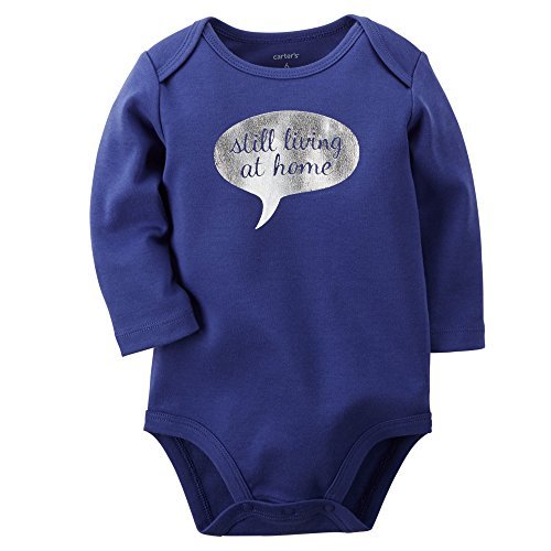 Long sleeved purple bodysuit from Carters;Snaps and expandable shoulders for easy changes;Still Living At Home slogan in silver bubble;100% Cotton;Machine Washable