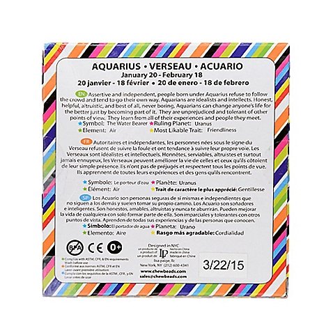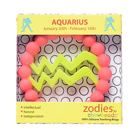 Zodies? Teether by Chewbeads Baby?;100% silicone teething ring; No BPA, no phthalates, no cadmium, no lead, no metals;Soft on babies gums and emerging teeth; Flexible design with multiple textures;Easily cleaned with dish soap and water, also dishwasher safe;Bright colorful sign depicts the signs of the zodiac; Attributes and description of each sign included on the individual packaging