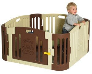 A gate panel with a sturdy latch allows the caregiver to open the gate for the child to easily enter or exit the yard, Tan/brown play zone, Molded plastic play yards are a place for little ones to stay safe, No need for caregiver to lift the child over the wall eliminating back strain, Pictured with vinyl foam filled mat, not included