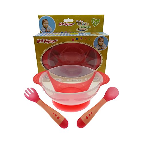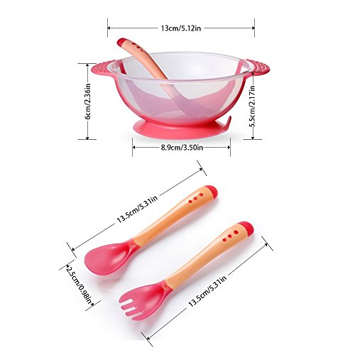 ベビー/幼児用Feedingシリコンボウルwith Stay +温度検知スプーン+フォークセット one size レッド M-153
