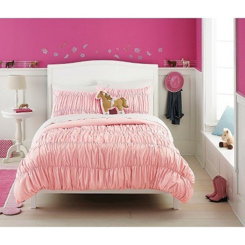 Shabby chic goes kid-sized with the Circo Pink Dot Banded Comforter Set. This children's bedding set boasts a pretty pink comforter with white polka dots and stylish textured ruching. A sheet set in white with a gray floral pattern completes the look. Includes comforter, flat sheet, pillowcase and pillow sham. Available for twin or full beds. Full sets include 2 pillow shams and 2 pillow cases. Bed Topper Features: Quilted Sheet Features: All Around Elastic on Fitted Sheet Pillowcase Features: French-Flat Closures Fiber Content: 100% Polyester, Fill Material: 100% Polyester, Weave Type: Plain Fabric Treatment: Peached finish Care and Cleaning: Machine wash, normal; Non chlorine bleach when needed; Tumble dry, gentle; Do not iron; Do not dry clean