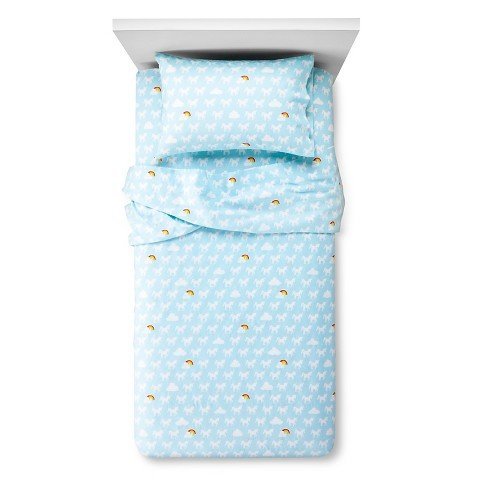 Cozy up with this CircoTM Unicorn Flannel Sheet Set. These flannel sheets are light blue with unicorns and clouds in white. There are a few colorful rainbows too. Nothing feels better in the winter than snuggling in flannel on a cold night. The set includes a fitted sheet, top sheet and 1 pillowcases depending on the size. Buy a second set of sheets so that you're ready to go on laundry day. Crisp clean bedding is the best way to guarantee a good nights sleep. Thread Count: 80 Sheet Features: All Around Elastic on Fitted Sheet Pillowcase Features: Double Turn Hems Includes: 1 Pillowcase included in Twin/ set, 1 Flat Sheet Weave Type: Plain Fiber Content: 100% Cotton, Fabric Treatment: Brushing Care and Cleaning: Machine wash, warm, Non chlorine bleach when needed, Tumble dry, normal, Iron, low,