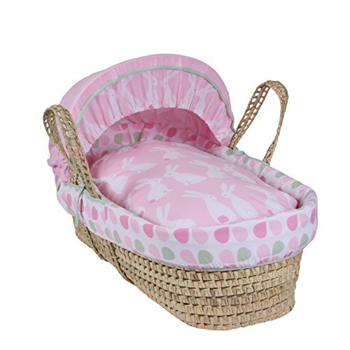 Moses Basket also includes: Padded liner, hood and hood fittings, mattress;50 % Cotton 50% Polyester;Perfect for your princess;Matching Rocking and Folding Moses Basket Stands also available;Features cute Pink Rabbits with a Mint Green trim with