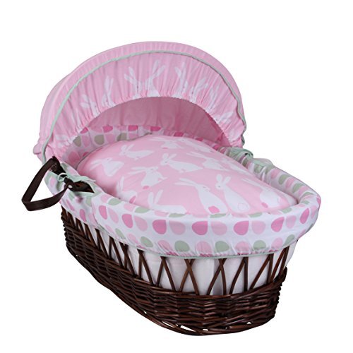 Moses Basket also includes: Padded liner, hood and hood fittings, mattress;50 % Cotton 50% Polyester;Perfect for your princess;Matching Rocking and Folding Moses Basket Stands also available;Features cute Pink Rabbits with a Mint Green trim with